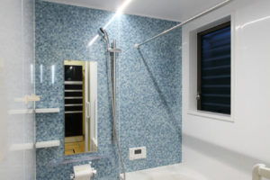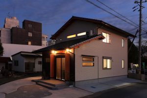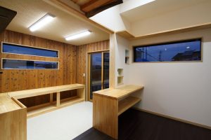 工夫がいっぱい!ペットと暮らす店舗付き住宅 キャットタワー&ウォークそして、こんぶをイメージした間接照明のあるオンリーワントイレ 間接照明と飾り棚がおしゃれな玄関。 和風飾り棚のあるトイレなど家族が喜んでくらせる家となっております。